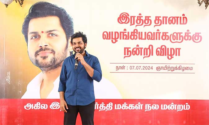 அதன்பின் நடிகர் கார்த்தி பேசும் போது, ”அனைவரையும் சந்தித்ததில் மிக்க மகிழ்ச்சி. எனது பிறந்தநாளில், இரத்த தானம் செய்த போதே, உங்களுடன் கலந்து கொள்ள நினைத்தேன். எனினும், உடல்நிலை சரியில்லாததால் கலந்து கொள்ள முடியாமல் போனது. அடுத்த முறை நிச்சயம் உங்களுடன் இணைந்து கொள்வேன். நீங்கள் அனைவரும் இரத்தம் கொடுத்ததில் மிக்க மகிழ்ச்சி.