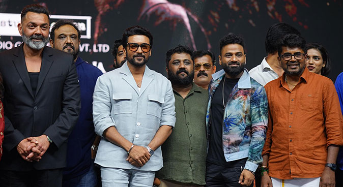 நிகழ்ச்சியில் நடிகர் சூர்யா பேசுகையில், “கதையின் நாயகன் நடிகர் சூர்யா பேசியதாவது, “அப்பாவிற்கு மரியாதை கொடுத்து, எங்கள் அனைவருக்கும் வாழ்த்து கூறிய சூப்பர் ஸ்டாருக்கு நன்றி. ரசிகர்களுடைய 27 வருட அன்பிற்கும் வாய்ப்பு கொடுத்த என்னுடைய அனைத்து இயக்குநர்கள் மற்றும் தயாரிப்பாளர்களுக்கு நன்றி. ஞானவேல் தாய்வீடு மாதிரி. அவரிடம் இருந்து தான் நிறைய விஷயங்கள் தொடங்கின. கார்த்தி நடிக்க தொடங்கியதற்கு ஞானவேல் தான் காரணம். என்னுடைய படிக்கட்டு பெரிதாவதற்கும், அடுத்த பாய்ச்சல் பாய்வதற்கும் எப்போதும் ஞானவேல் காரணமாக இருந்துள்ளார். எப்போதும் மார்க்கெட்டை விட பெரிதாக செய்வதற்குத் தயாராக இருப்பார். பாபி என்னுடைய உடன்பிறக்காத சகோதரர். அவரை நான் நிறைய சைட் அடித்திருக்கிறேன். அவர் நடித்ததால், இந்தப் படம் பான் இந்தியா படம் ஆகியிருக்கிறது. யோகி பாபு நல்ல அறிவான நடிகர். தமிழ் வளர வேண்டும் என்று நினைத்து மதன் கார்க்கியும், அவரது நண்பர்களும் நிறைய வேலை செய்கின்றனர். சினிமா வெறும் பொழுதுபோக்கு மட்டும் அல்ல. அது ஒரு குரல். அதனால், சினிமாவை நாம் நிச்சயம் முன்னெடுத்துச் செல்ல வேண்டும். 27 ஆண்டுகளுக்குப் பிறகு, சிவா எடுத்து வந்த இந்த பொக்கிஷத்தில் இருக்கும் காட்சிகள் மிகவும் புதியதாக இருக்கும். தமிழ் சினிமாவை முன்னெடுத்துச் செல்லும் அத்தனை உழைப்பையும் இந்தப் படத்தில் நாங்கள் அனைவரும் போட்டிருக்கிறோம். 107 நாள்கள் எப்படி போனது என்றே தெரியவில்லை.